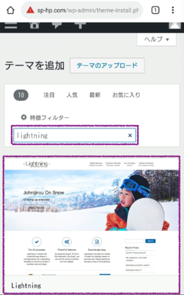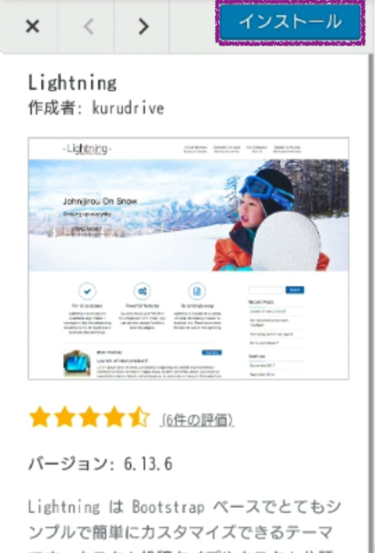 ここでは例としてシンプルなテーマ「Lightning」をインストールします。