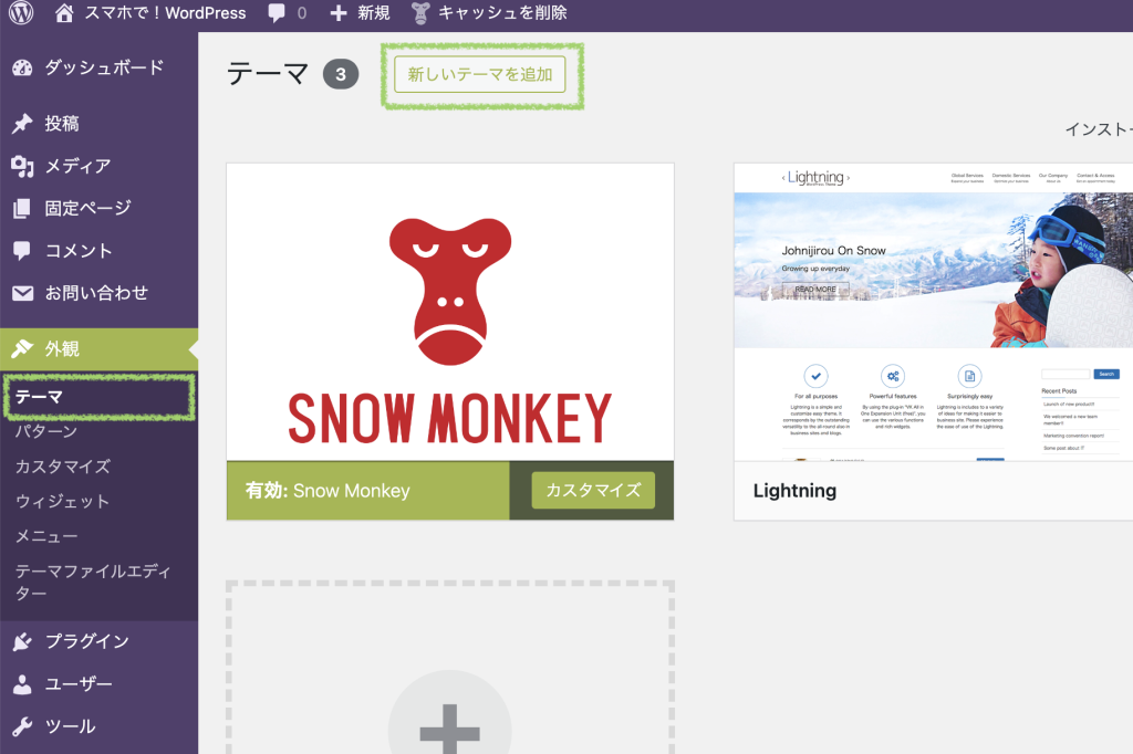 「WordPress 管理画面 → 外観 → テーマ → 新しいテーマを追加」から検索してインストールすることができます。
