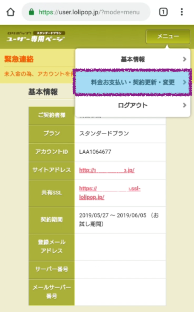 メニューから「料金お支払い・契約更新・変更」を選択。