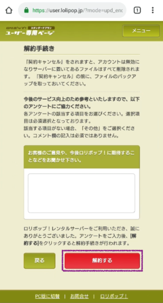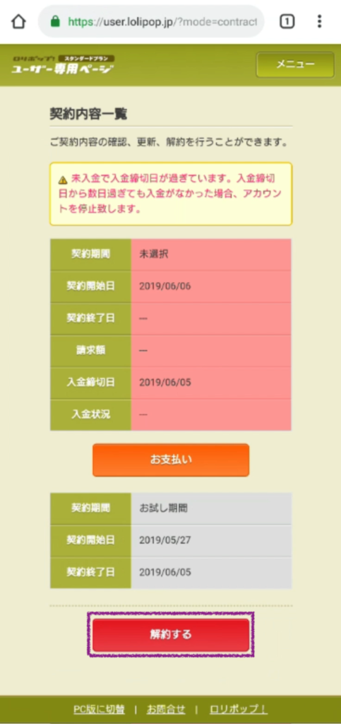 画面一番下の「解約」ボタンを押します。次のページで一番下の「解約フォームへ」ボタンを押します。