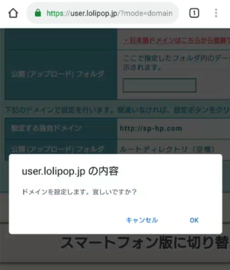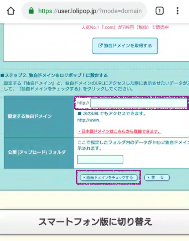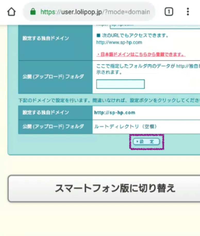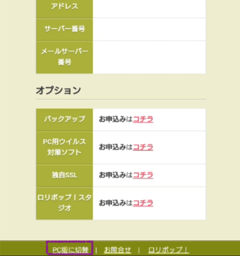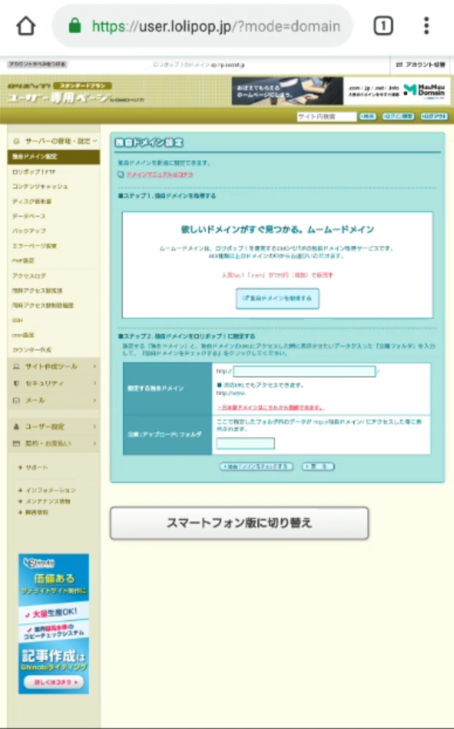 残念ながら独自ドメインを設定するページはスマホからは見れないので、画面一番下の「PC版に切り替え」へ進みます。(2020年2月確認)