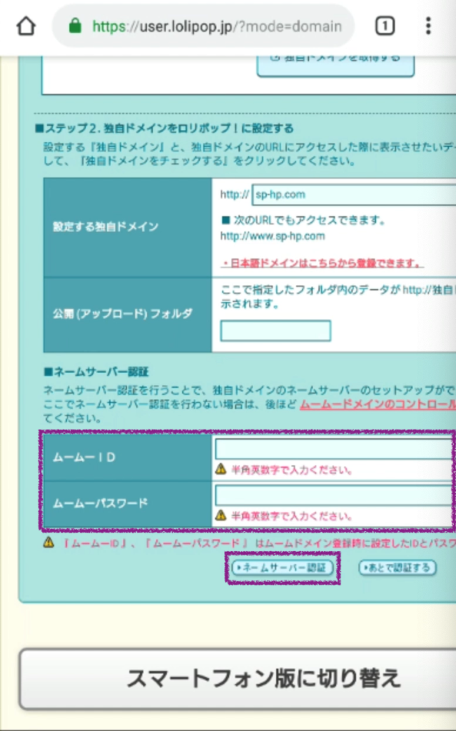しばらくすると、すぐ下にムームーIDとムームーパスワード欄が表示されるので入力して「ネームサーバ認証」ボタンを押します。