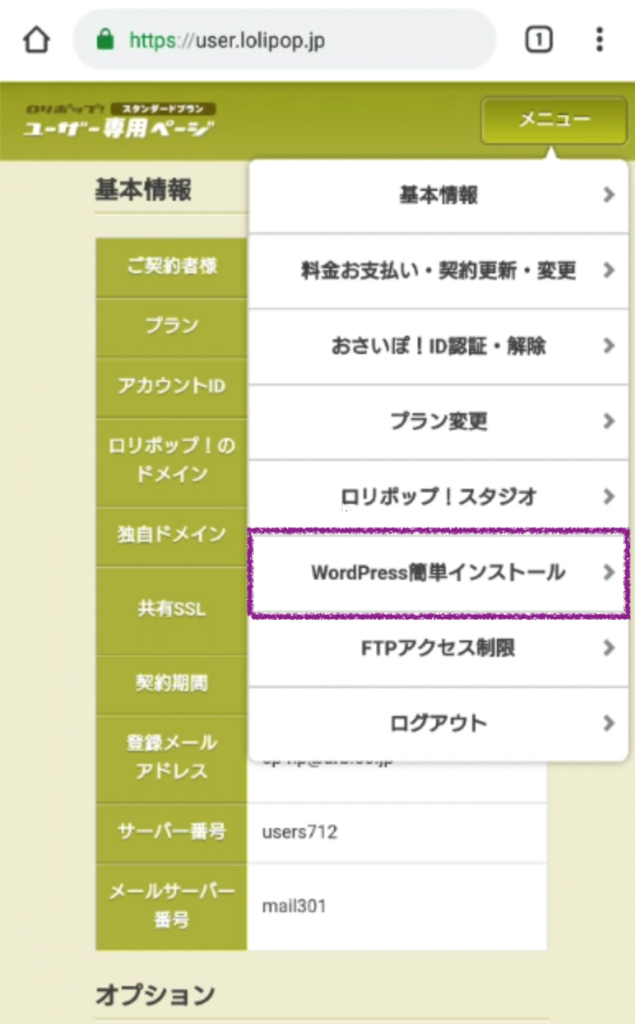ロリポップ!レンタルサーバのユーザ専用ページのメニューから「WordPress 簡単インストール」へ進みます。