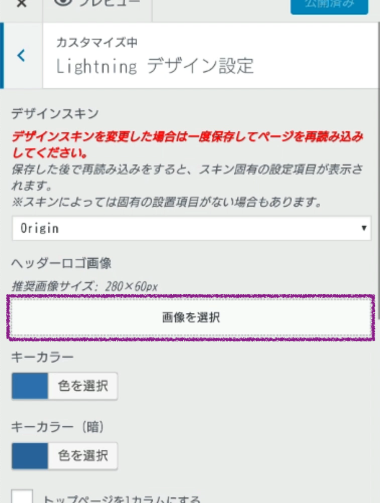 ロゴを変更するには、メニューから「外観 → カスタマイズ」へ進み、Lignting デザイン設定を見てみましょう。