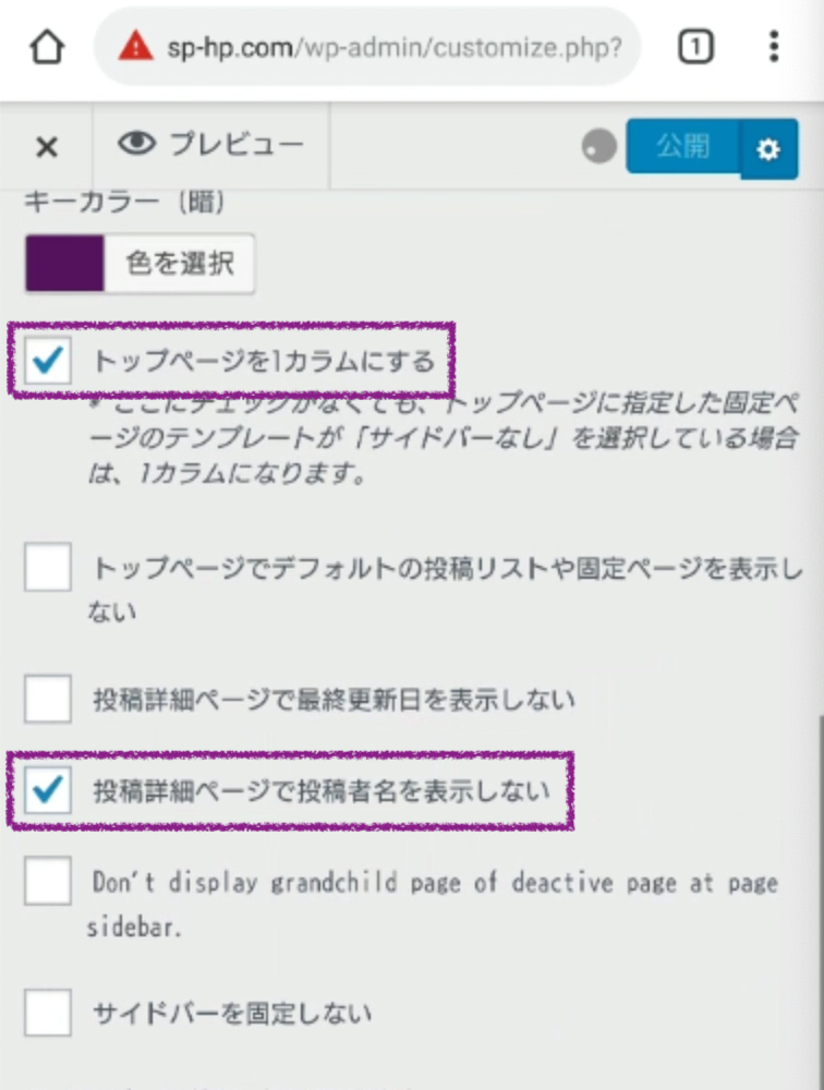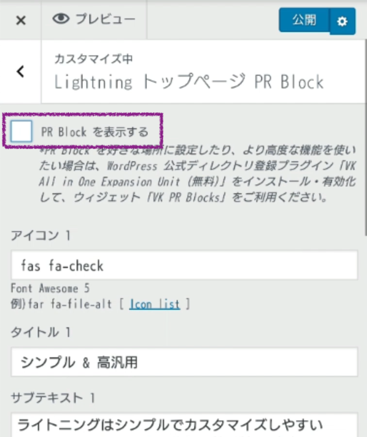 「PR ブロックを表示する」のチェックを外して「公開」ボタンを押します。