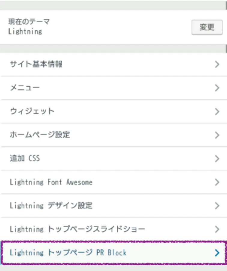 メニューから「外観 → カスタマイズ」へ進み、「Lighting トップページ PR Block」から設定変更します。