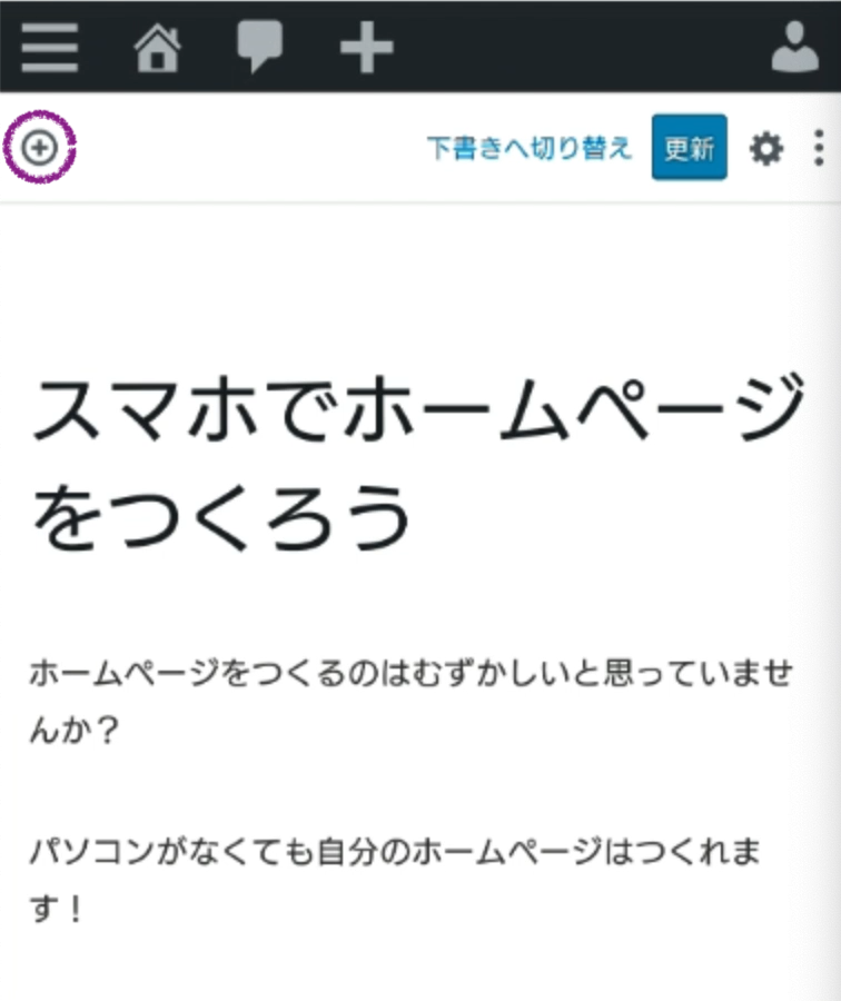 ページの編集画面から、左上の「+」アイコンを押して、ブロック一覧を表示します。