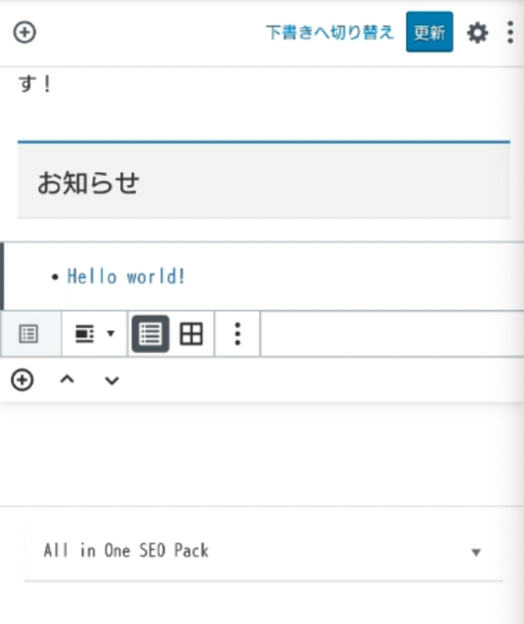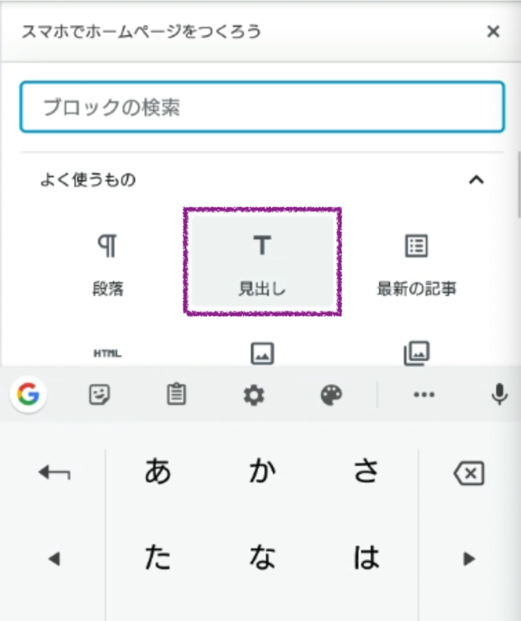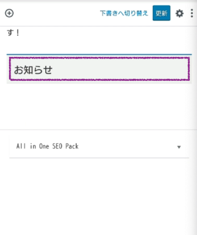 「一般ブロック → 見出し」を追加、お知らせを表示するコーナーのタイトルテキストを入力します。