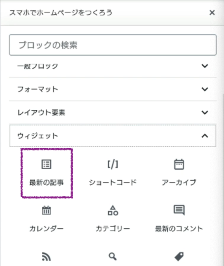 さらに「+」アイコンから「ウィジェット → 最新の記事」を追加します。