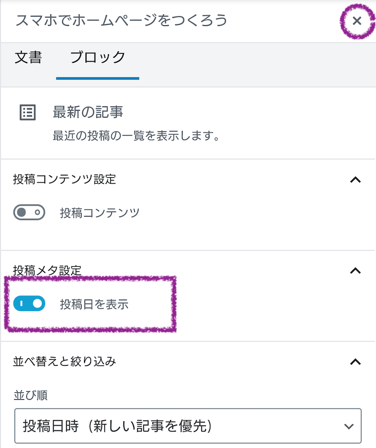 「投稿日時を表示」をチェックしたら右上の「☓」ボタンで設定を閉じます。